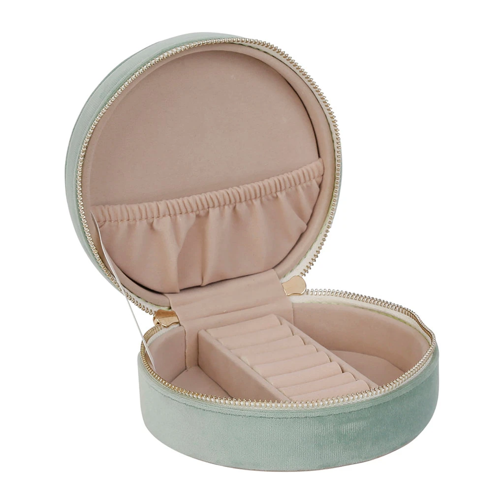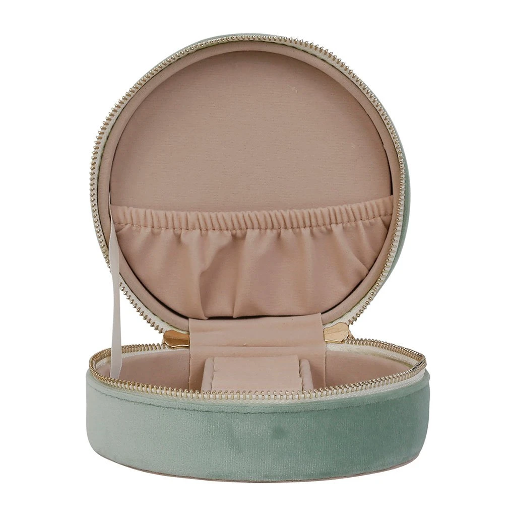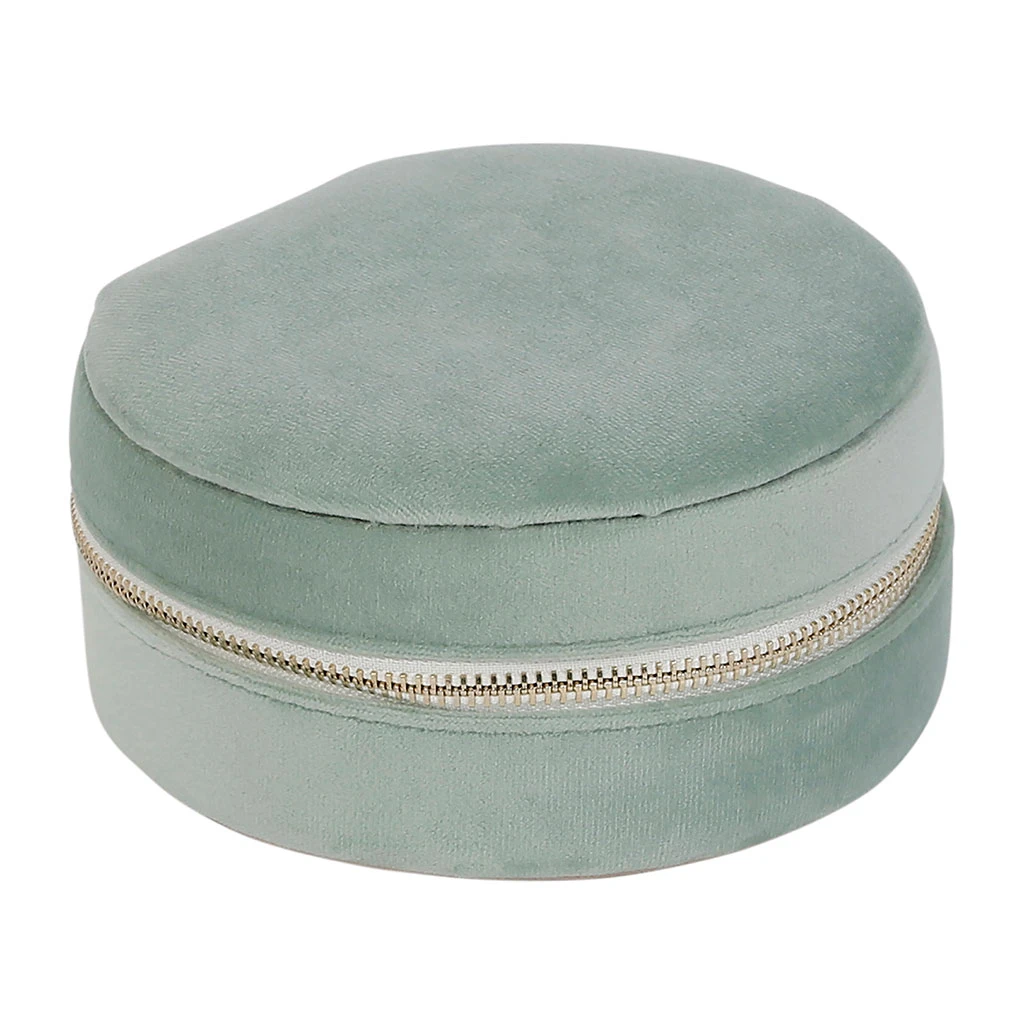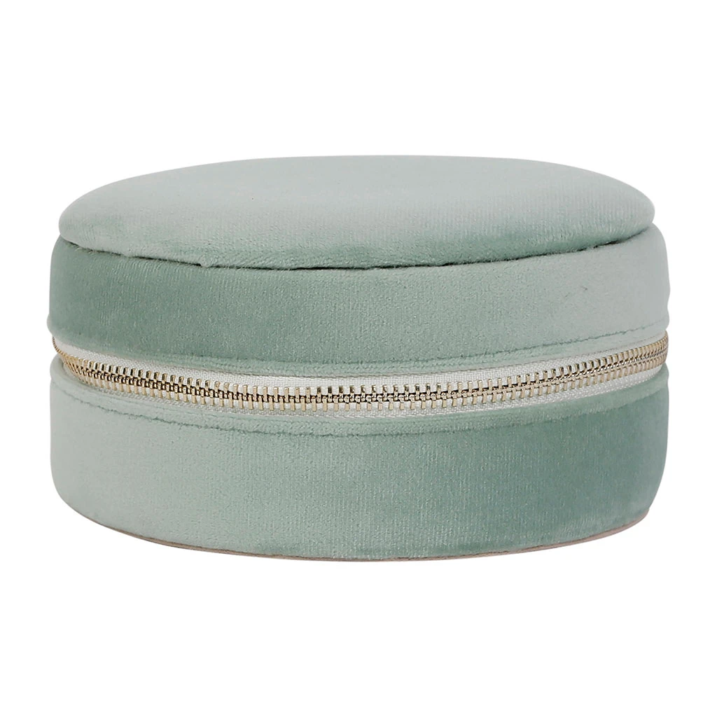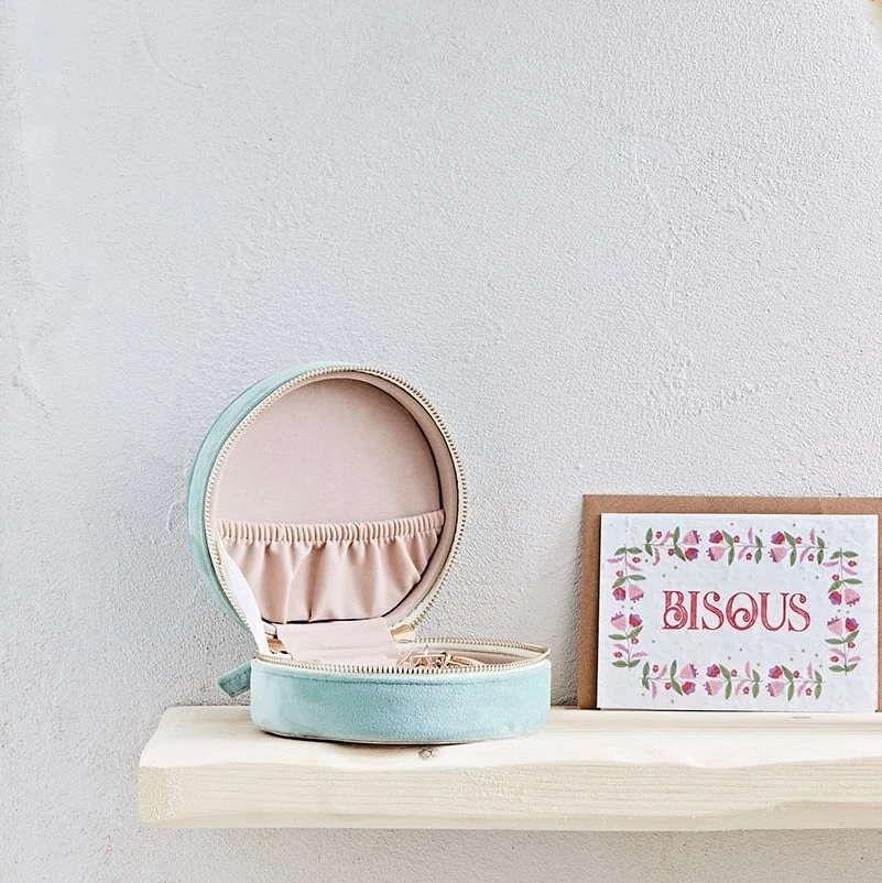 Venez découvrir notre Boite bijoux ronde tropic’art vert d’eau velours polyester de la marque SEMA Design à découvrir sur Fabrique de Styles.